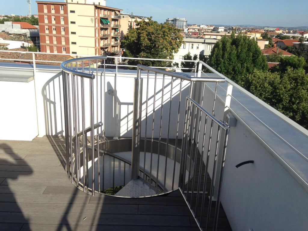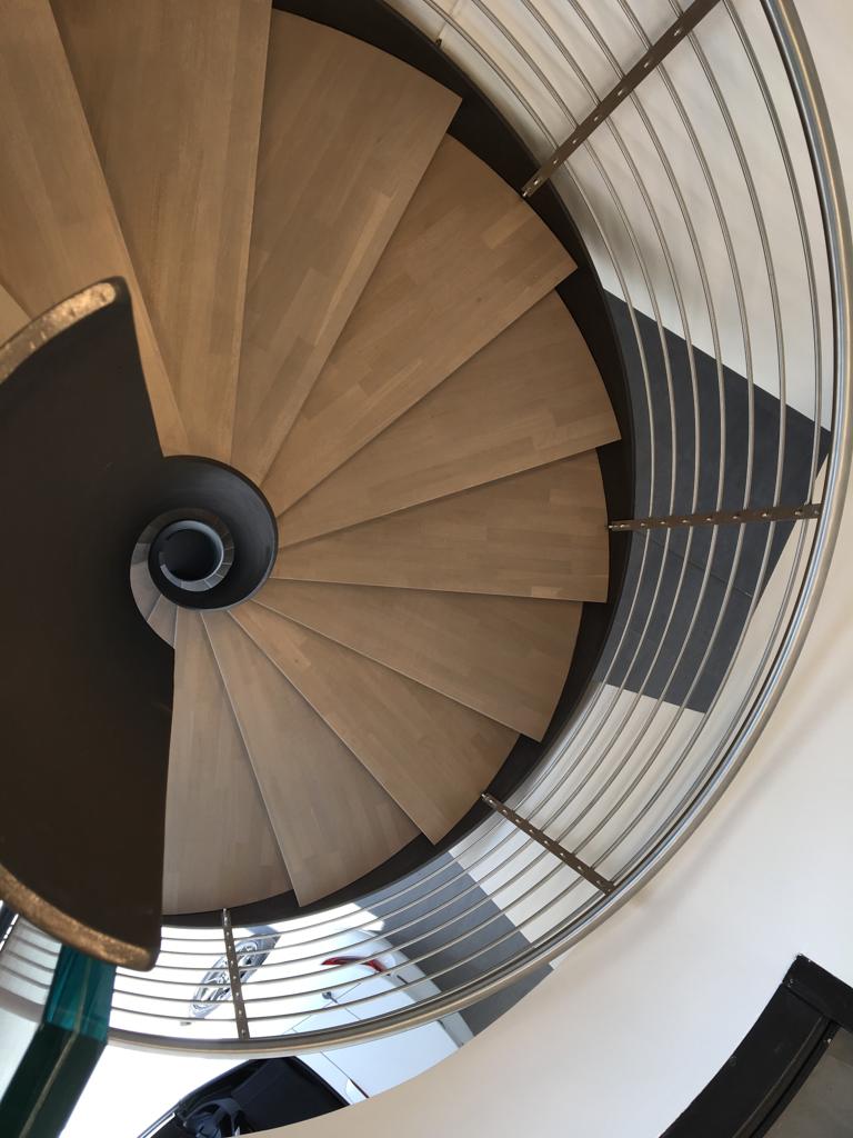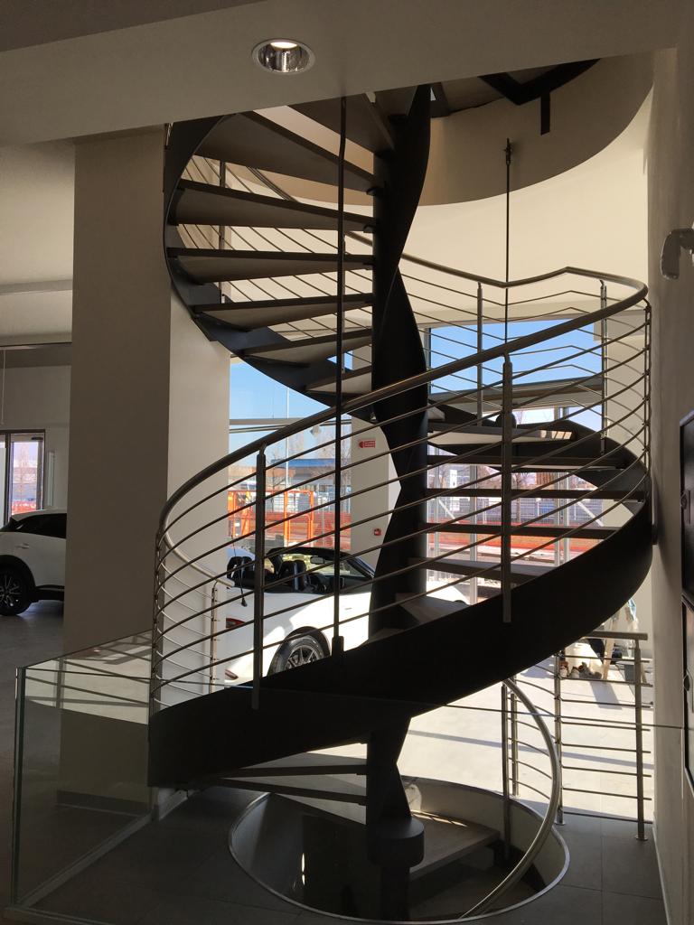 Particolare scala interna in lamiera sagomata al laser e tubo centrale di sostegno.