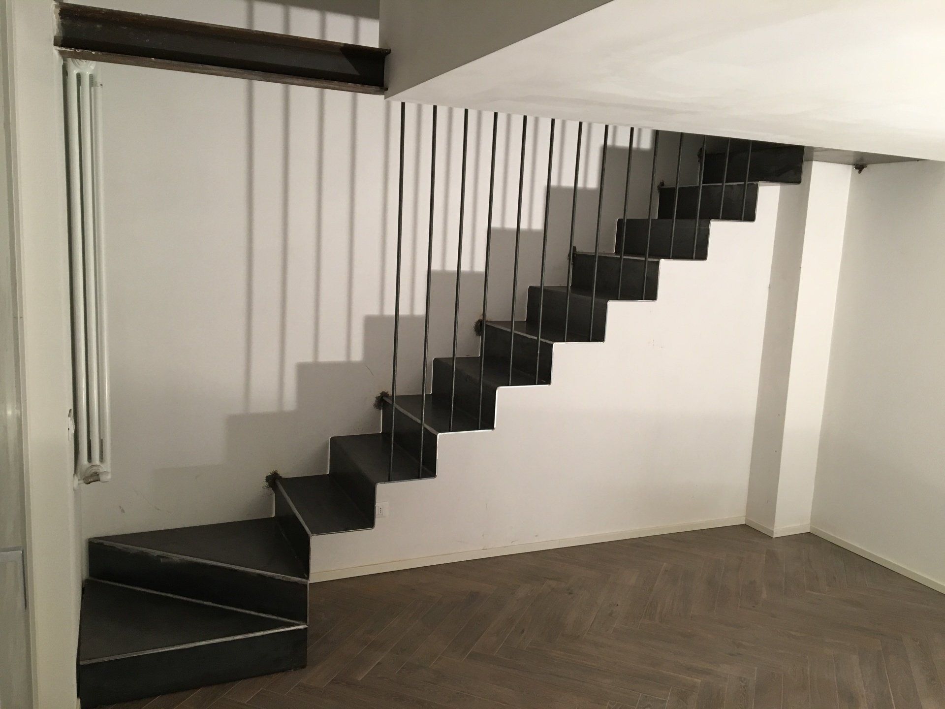 Scala con gradini in lamiera sagomata e cosciale affogato nel muro.
